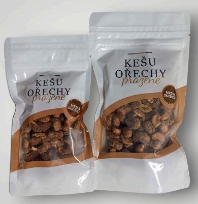 Kešu ořechy pražené s medem a skořicí, hmotnost 80 g. Původ ořechů: Uganda. (Foto bude upraveno, na obrázku 80g + 150g).