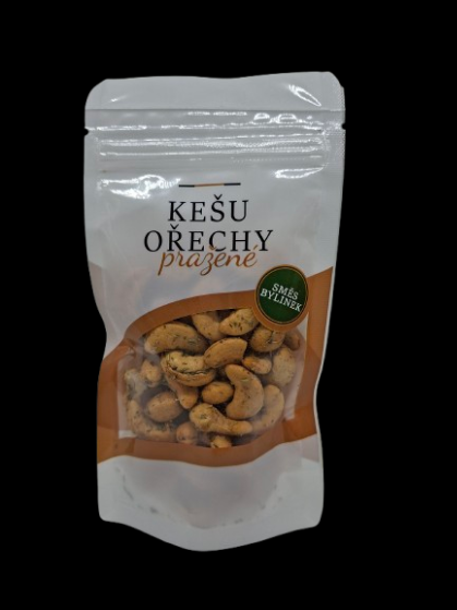 Kešu ořechy pražené solené s bylinkami, hmotnost 80 g. Původ ořechů: Uganda.