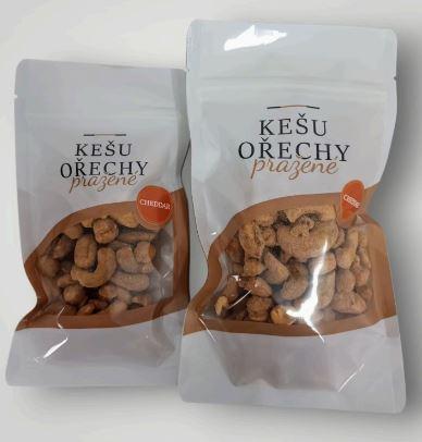 Kešu ořechy pražené solené s cheddarem (čedarem), hmotnost 80 g. Původ ořechů: Uganda. (Foto bude upraveno, na obrázku 80g + 150g).