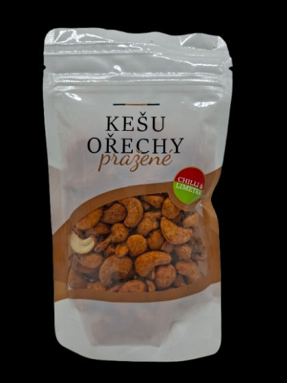 Kešu ořechy pražené, solené mořskou solí a dochucené chilli a limetkou.