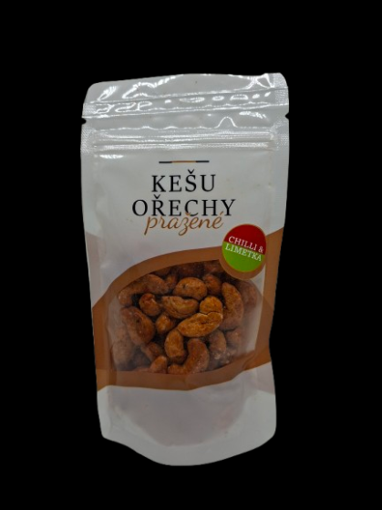 Kešu ořechy pražené, solené mořskou solí a dochucené chilli a limetkou.