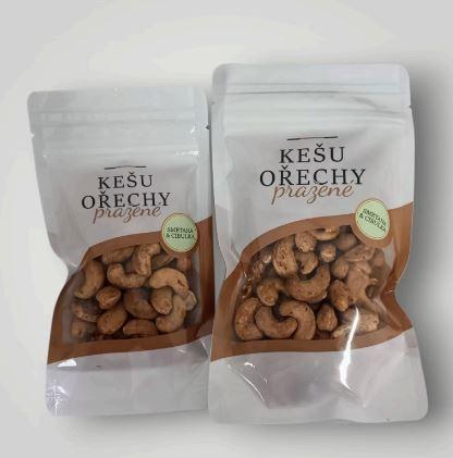 Kešu ořechy pražené solené s příchutí zakysané smetany a cibulky, hmotnost 80 g. Původ ořechů: Uganda. (Foto bude upraveno, na obrázku 80g + 150g).