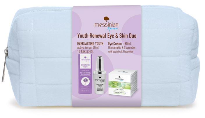 Messinian Spa Kosmetická taštička obsahuje Sérum na obličej & krk Bakuchiol & kyselina hyaluronová & smil 30 ml a oční krém vilín & okurka 30 ml. K zakoupenému setu dostanete ZDARMA papírovou tašku s logem MESSINIAN SPA.