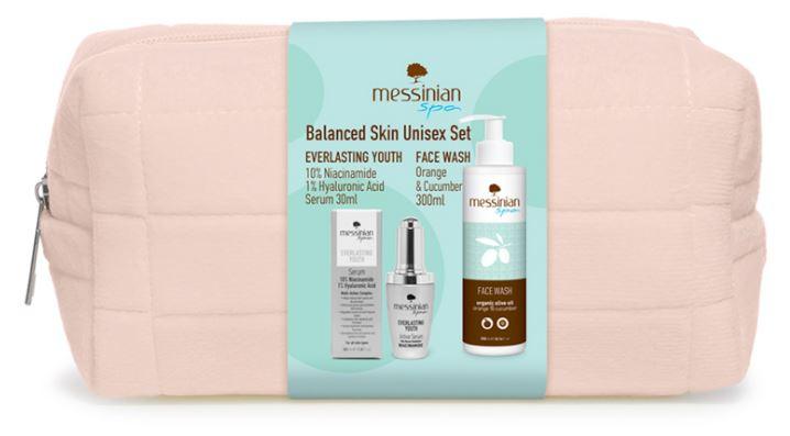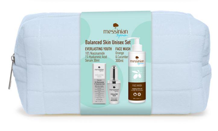 Messinian Spa Kosmetická taštička obsahuje Sérum na obličej & krk Niacinamid & kyselina hyaluronová 30 ml a mycí gel na obličej okurka & pomeranč 300 ml. K zakoupenému setu dostanete ZDARMA papírovou tašku s logem MESSINIAN SPA.