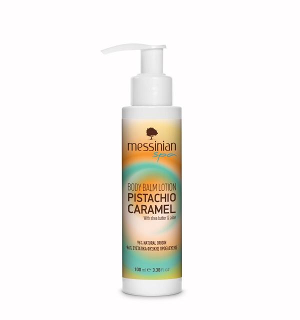 96 % PŘÍRODNÍCH SLOŽEK. Messinian Spa tělový balzám s vůní pistácie a karamelu 100 ml. Obohacený o bambucké máslo a extra panenský olivový olej Kalamata. Vhodné i pro děti od 3 let.