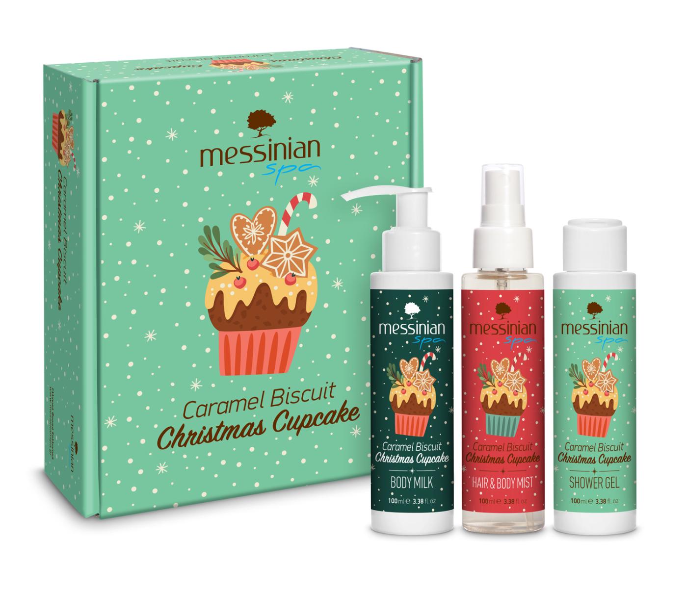 Messinian Spa dárkový set vánoční cupcake s vůní karamelových sušenek 3x100 ml obsahuje tělové mléko, vlasový a tělový sprej a sprchový gel. K zakoupenému setu dostanete ZDARMA papírovou tašku s logem MESSINIAN SPA.